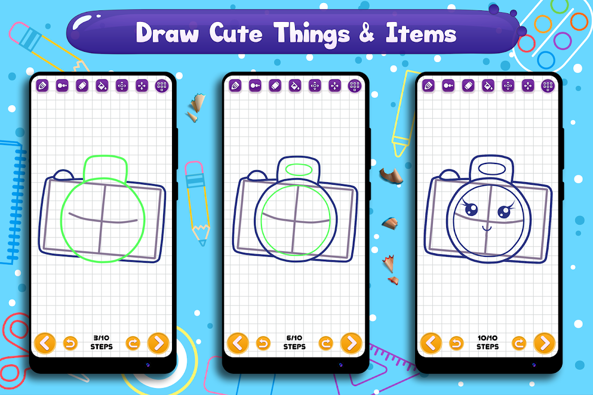 Learn to Draw Cute Things & Items is perfect app for those who want to be an artist and love drawing cute things. This App teaches you how to draw cute kawaii things in simple steps and improve your confidence of drawing and coloring.