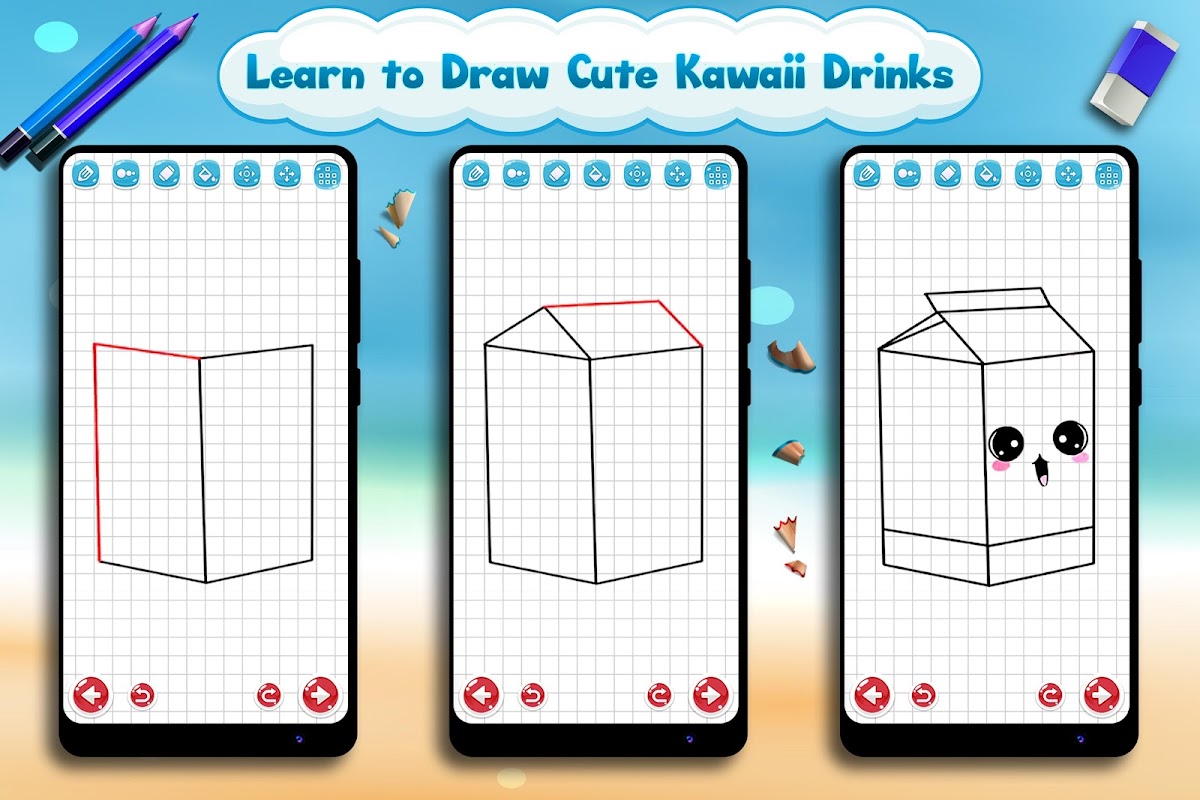Naucz się rysować słodkie napoje i soki to idealna aplikacja dla tych, którzy chcą być artystami i uwielbiają rysować słodkie rzeczy. Ta aplikacja uczy, jak narysować słodkie napoje kawaii w prostych krokach i zwiększyć pewność rysowania i kolorowania.