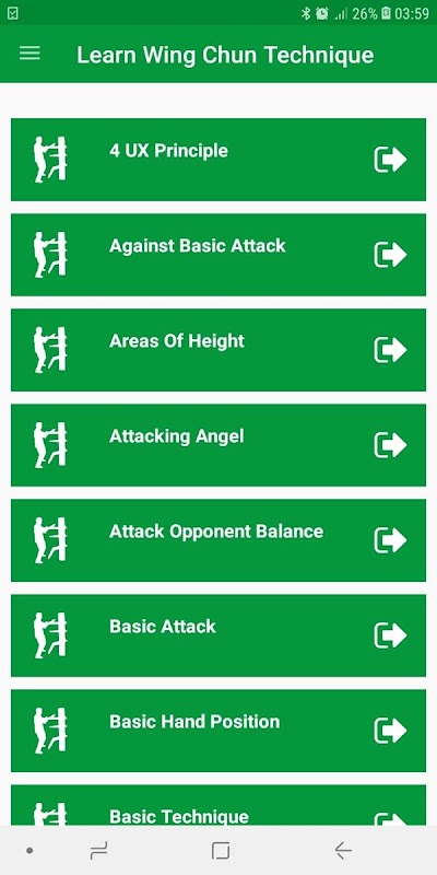 Korzystając z tej aplikacji, uzyskasz wiele podstawowych technik wing chun, których możesz nauczyć się w domu. Niektóre techniki wing chun zawarte w tej aplikacji to: