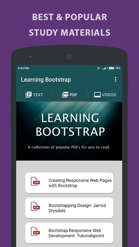 W Learning Bootstrap -Tutorial podzieliliśmy strukturę w taki sposób, aby nowy programista łatwo zrozumiał podstawowe pojęcia w łatwy i interaktywny sposób. Oprócz tekstu, dołączyliśmy również zestaw specjalnie dobranych przez nas podręczników PDF, dzięki którym można zdobyć większą wiedzę na temat wykorzystania Bootstrapa. Przygotowaliśmy także samouczek wideo i dodaliśmy go do naszej aplikacji, aby uzyskać praktyczne informacje na temat działania systemu startowego.