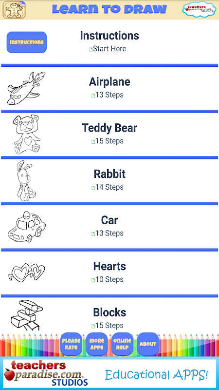 Learning to Draw Game by TeachersParadise.com Studios is a simple and easy free drawing game for the whole family to learn step by step drawing and coloring with easy to follow instructions.