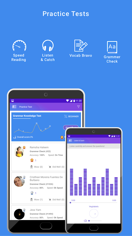 You will practice and gain expertise in vocabulary and grammar skills by answering questions selectively chosen for every level. You also learn interesting Grammar tips and Vocab goals. Listening and reading skills can be improved by providing users comprehension passages.
