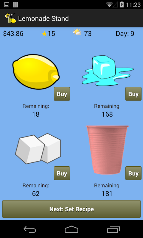 Stojak Lemoniada to klasyczna gra, gdzie można kupić składniki, ustawić receptury i cenę, i sprzedawać lemoniadę spróbować zarobić. Stojak Lemoniada pozwala kontrolować każdy aspekt swojej działalności lemoniady. Czy można zwiększyć zadowolenie klientów, coraz więcej klientów przyjdzie do twojego stoiska z lemoniadą.