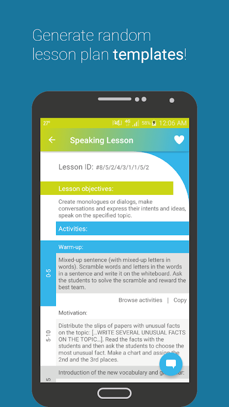 Plan lekcji jest aplikacją, która generuje 50-minutowej lekcji angielskiego planuje szablonów (z zestawem nowoczesnych konstrukcji metodologii). Wszystkie części lekcji są dopasowane do prawie wszystkich (cross-grade) poziom studentów. Każda część składa się z 9 lekcji losowo generowanych zabawnych działań ESL.