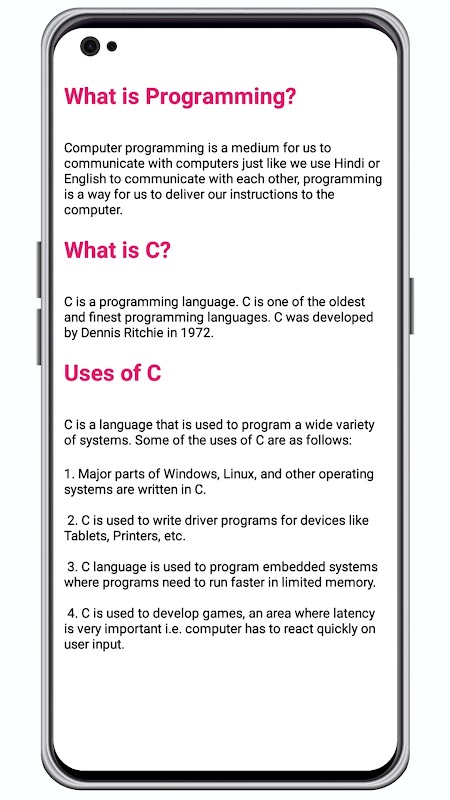 It is a C language book app and this app helps you to learn c language in easy way with shorts notes and also watch video tutorial.For your best practice this app includes prectical and Quiz section.