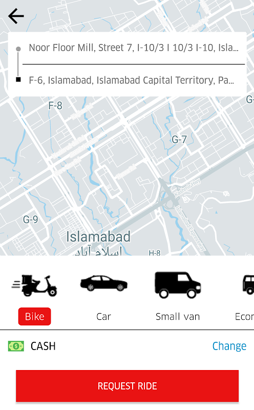 • Open the app and set a pick up and drop off location.