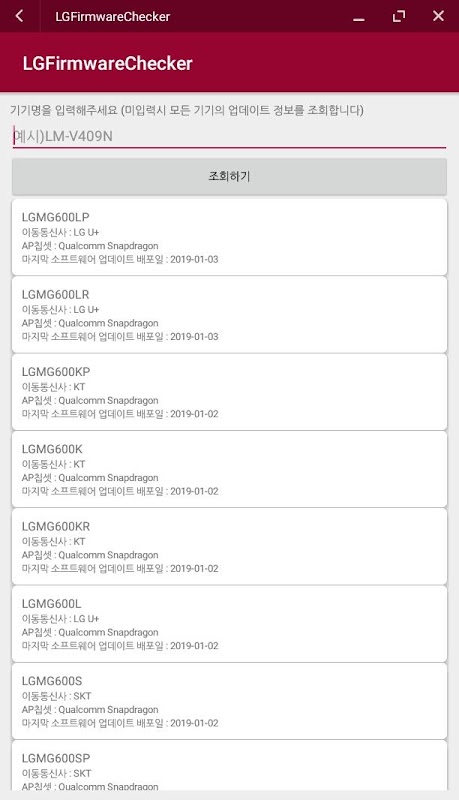 Sprawdź wszystkie informacje dotyczące urządzeń LG lub przefiltruj je za pomocą kodu urządzenia, na przykład LM-V409N