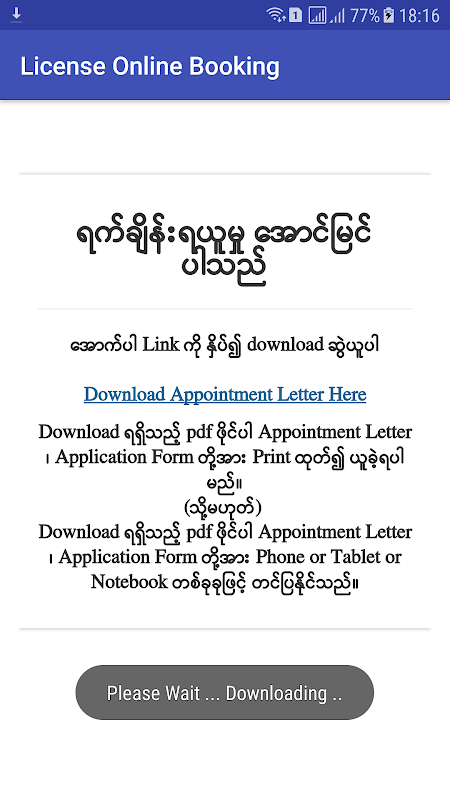 မိမိလိုင္စင္ေျဖဆိုရန္ Booking လုပ္ထားေသာေလၽွာက္လႊာကုိ Download လုပ္ျပီးျခင္း app တြင္ခ်က္ျခင္းျပေပးပါသည္။
