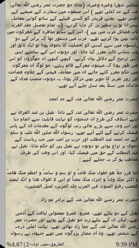 Most of the Urdu apps developer use scan images of book and that make their apps big in size but i use unicode in my Urdu Apps so it use less space.This urdu islamic app doesn’t need any external data download after installation. This is only a single file download, just install and read the biography of Hazrat Umar Farooq (R.A).