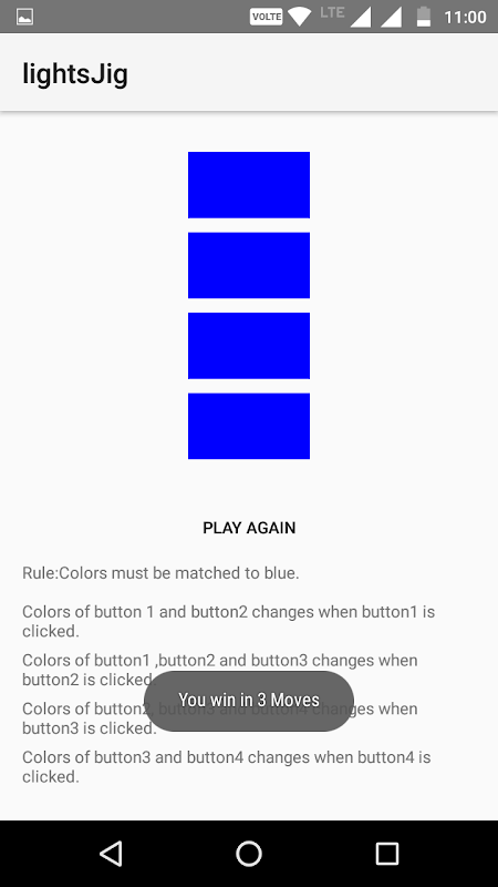 In LightsJig, the user is presented with 4 coloured buttons changing from red, yellow, blue colours. Pressing the button changes 2 or 3 buttons as per the rules, the user has to find the pattern of colour change and try to get all buttons to display blue to win.