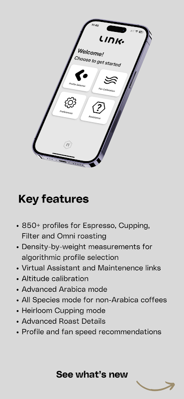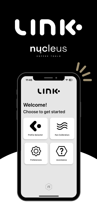Aplikacja Link to aplikacja mobilna dołączona do palarni Link Sample Roaster firm Nucleus Coffee Tools i Kaffelogic. Korzystając z tej aplikacji, użytkownicy Link mogą wprowadzić szereg informacji na temat kawy, którą chcą wypalić, a algorytmiczny wybór profilu w aplikacji zapewni najbardziej idealne rekomendacje dotyczące pakietu profilu palenia, krzywej mocy/profilu palenia, sugerowanego zakresu rozwoju, działania wentylatora ( prędkość wentylatora) i oczekiwane pierwsze pęknięcie dla każdej kawy.