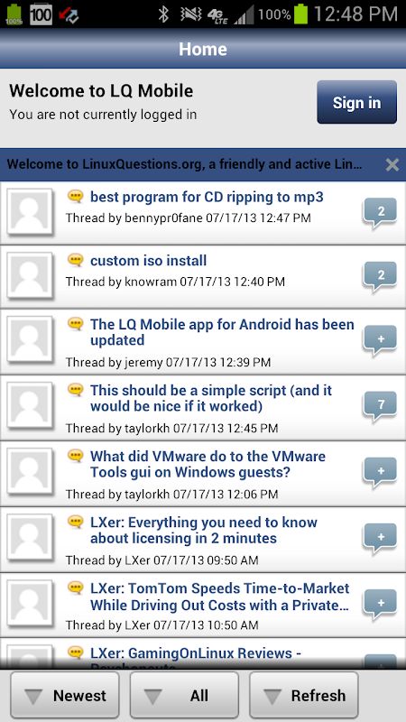 With LQ Mobile, you can access the LinuxQuestions.org forums directly from your Android device.