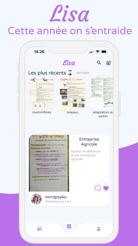 Construit sur un modèle de réseau social, Lisa te permet de chercher les cours dont tu as besoin. Utilise l'outil de recherche pour trouver un cours précis ou explore la plage d'accueil en fonction de ton niveau d'étude ou de tes matières préférées pour trouver ce qu'il te faut.