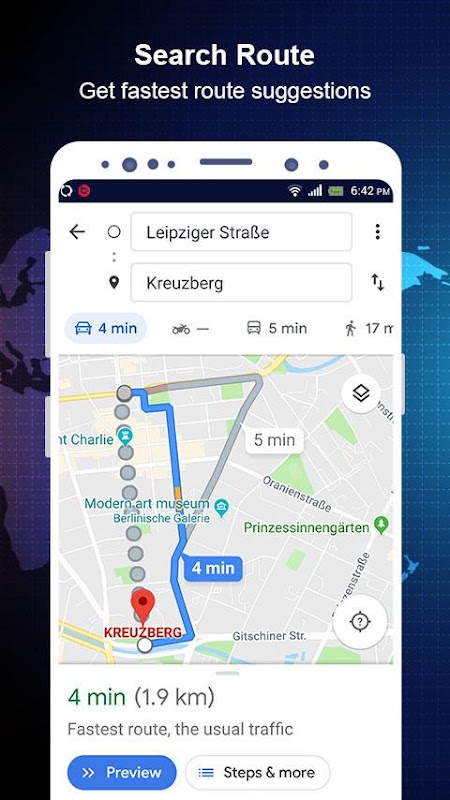 Wyszukiwarka tras GPS - GPS, mapy, nawigacja i ruch z wieloma funkcjami, takimi jak najkrótsza wyszukiwarka tras GPS, trasa jazdy, aktualna lokalizacja, nawigacja, kierunki, lokalizator mapy, udostępnianie lokalizacji znajomym i rodzinie.