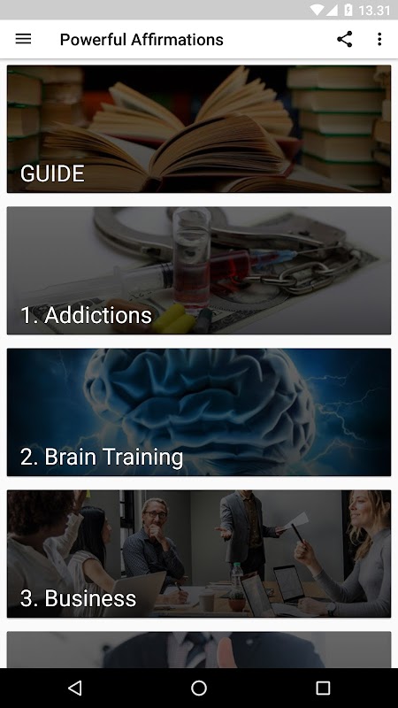 Features: quick and easy navigation, user friendly interface, affirmation categories, present tense affirmations, future tense affirmations, natural affirmations.