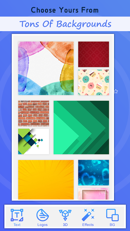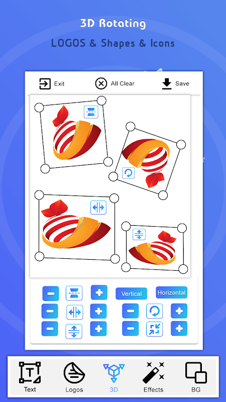 icons With a Better Control there is a Good Collection of 2d Logos and 3D logos You can Say it is a 3D logo maker too. We also have provided many background options you can add logos to you photos also you can add gradients and logo, colors and etc.logo adder to pics and watermark on pics with logo builder and logo editor.