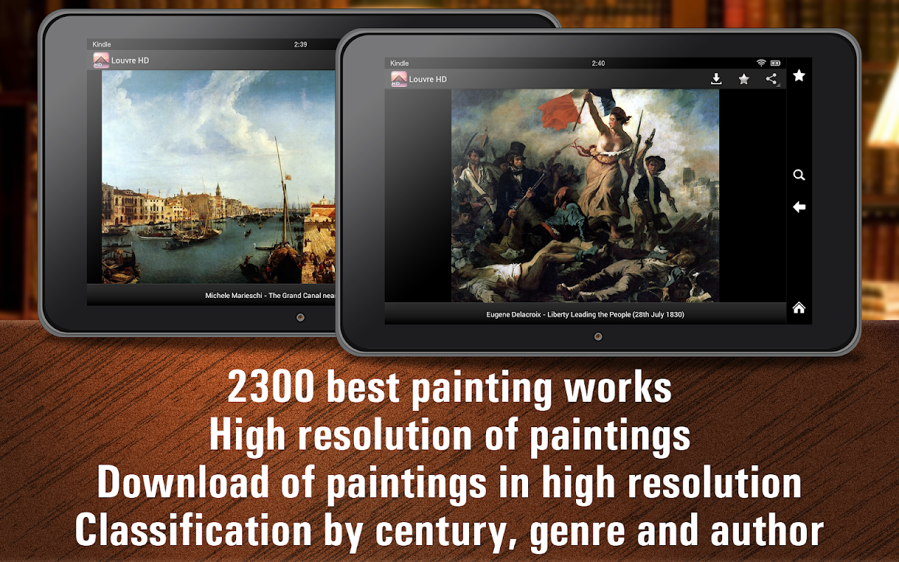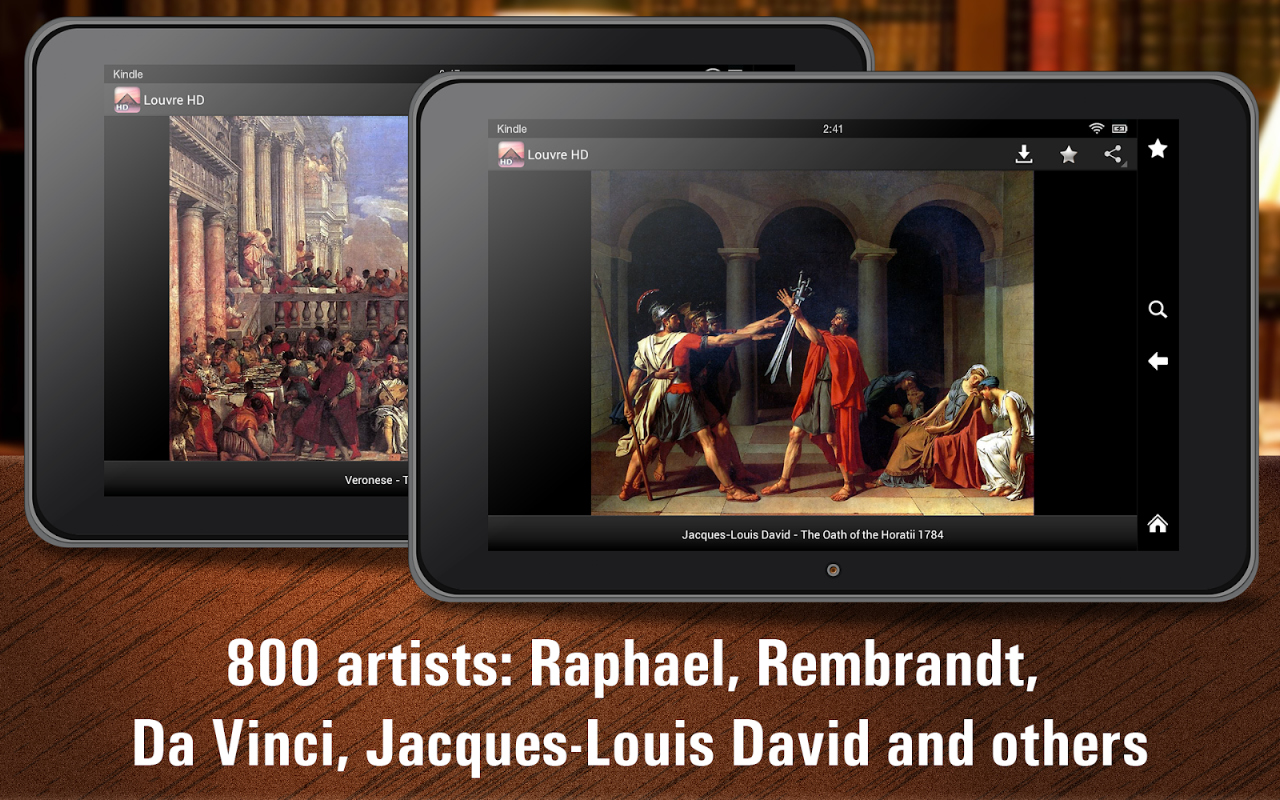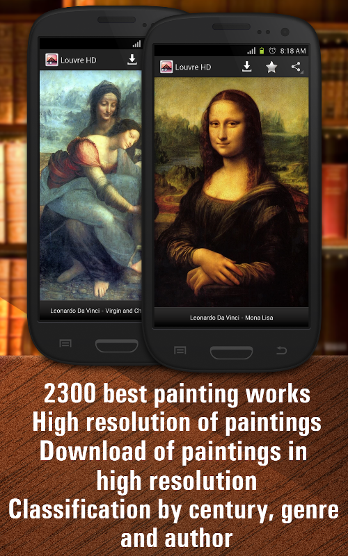 The application contains a collection of 2300 paintings of the Louvre Museum. Here you will find the works of Raphael, Rembrandt, Da Vinci, Veronese, Delacroix and many other eminent masters of painting.