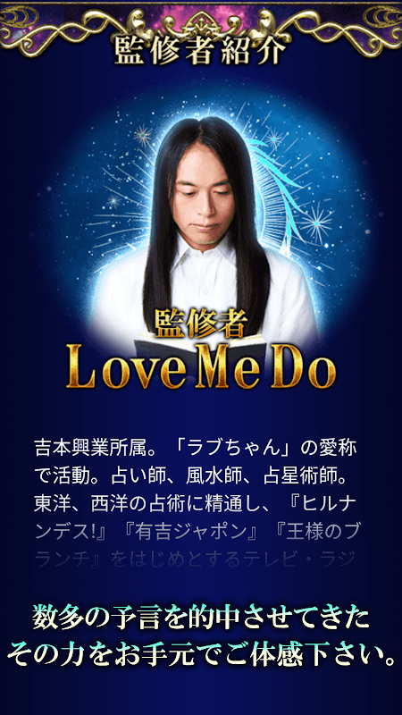 芸能人や芸人のブレイクや予言、政界の重大ニュース、プロサッカーの試合結果や得点選手、自然災害の予言など、数々の予言的中エピソードを持つ業界最注目の占い師として絶大な人気を誇る。