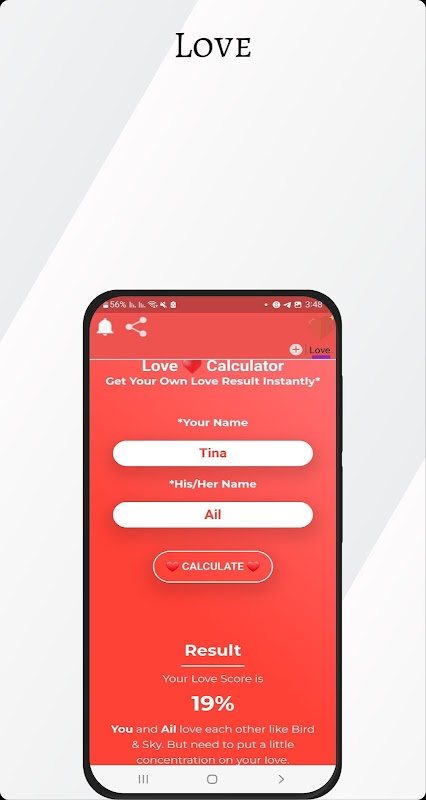 You and also use True Love Tester for enjoyment with friends and share love percentage to others.