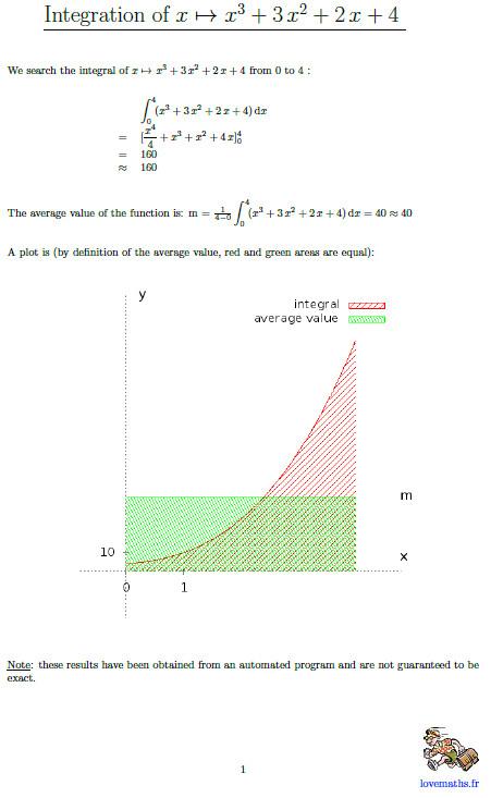 W celu obliczenia całek należy określić funkcję w pierwszym polu tekstowym. Dolną i górną granicę całki należy podać w drugim polu tekstowym jako przedział (np. [3; + ∞ [)]. Jeśli nie określono interwału w czasie, komunikat „Go!” naciśnięty jest przycisk, obliczana jest funkcja pierwotna. Jeśli chodzi o badanie funkcji, wynikiem jest plik PDF. Wymagany jest dostęp do Internetu. W przypadku wprowadzenia złej funkcji lub błędnego interwału lub jeśli wystąpi problem podczas próby połączenia z Internetem, wyświetlany jest opisowy komunikat o błędzie.