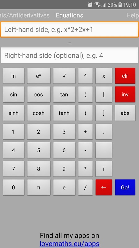 W przypadku równań lub rozwiązywania nierówności lewa strona równania lub nierówności, np. x ^ 2 + x + 2, należy określić w pierwszym polu tekstowym. Prawa strona, w drugim polu tekstowym, jest opcjonalna i zostanie ustawiona na 0, jeśli pozostanie pusta. Następnie musisz wybrać znak = (który jest domyślny) dla równania lub znak <, ≤, ≥ lub> dla nierówności. Po naciśnięciu przycisku „Go!” przycisk, rozwiązania równania lub nierówności (jeśli występują) są podawane w pliku PDF. W przypadku wprowadzenia złego równania lub nierówności lub jeśli wystąpi problem podczas próby połączenia się z Internetem, wyświetlany jest opisowy komunikat o błędzie.
