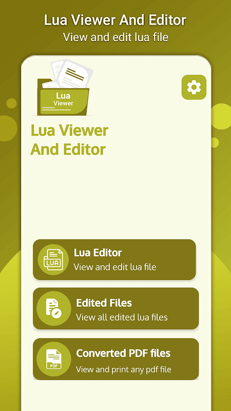 Lua Viewer to szybka, lekka i łatwa w użyciu aplikacja do czytania, której możesz używać do odczytywania i konwertowania dowolnych plików Lua na pdf na swoim urządzeniu bez utraty kodu. Możesz bezpośrednio wydrukować plik pdf. Możesz także użyć aplikacji do przeglądania plików PDF zapisanych w urządzeniu. Wszystkie edytowane pliki przeglądarki lua są zapisywane w urządzeniu i przeglądane w aplikacji, aby otworzyć je bezpośrednio w edytorze.
