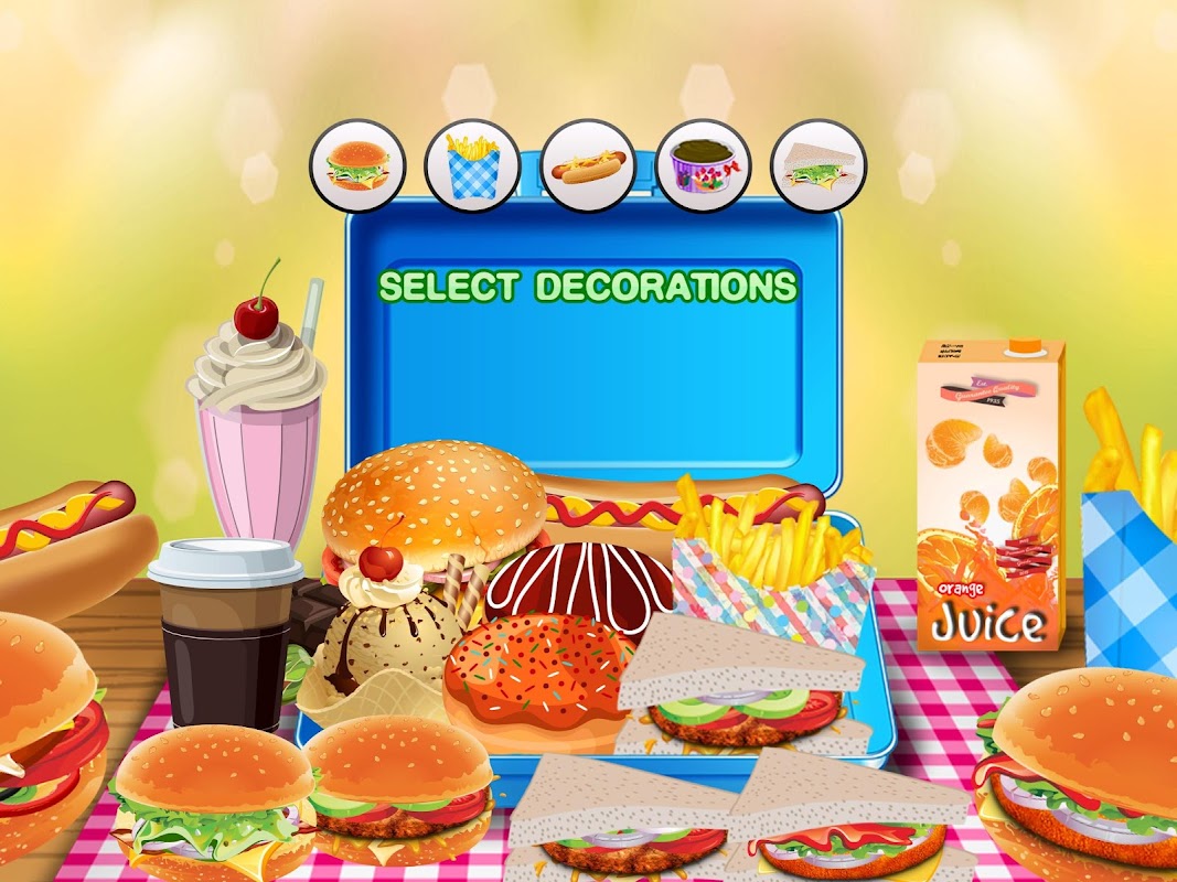 Your task is to assemble the best and most delicious, inspiring and thrilling lunch box for your school and lunch breaks. Your job is to make the most amazing and unique lunch box combinations by using the blend of sandwiches, burgers, hot dogs and fries.