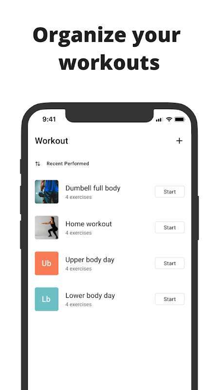 - Create home or gym workouts