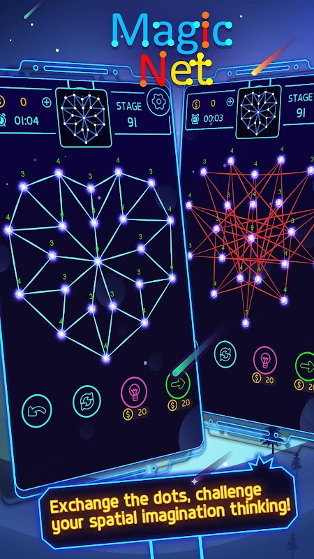 Magic Net to bardzo interesująca gra logiczna polegająca na odszyfrowywaniu, gracze muszą rozwikłać skomplikowane, przeplatane połączenie sieci magicznej, tworząc linię, która się nie przecina. W grze zaprojektowano setki różnych stylów sieci krzyżowych, aby czekać, aż gracz odblokuje je krok po kroku. W rzeczywistości szybkie oczyszczenie Magic Net nie jest trudne. O ile będziemy przestrzegać zasady najkrótszej linii między dwoma punktami, skomplikowane połączenie zostanie rozmontowane na trójkąty, aby łatwo osiągnąć osiągnięcie wszystkich nieprzecinających się odcinków linii. Ta gra oferuje setki poziomów do sprawdzenia, od prostych do złożonych, krok po kroku, aby rzucić wyzwanie wyobraźni przestrzeni, gdy rozwikłasz złożone linie i zamienisz je w piękną grafikę, będziesz mieć niezrównane poczucie spełnienia. I szybko pobierz zabawę, ciesząc się grą ze znajomymi.