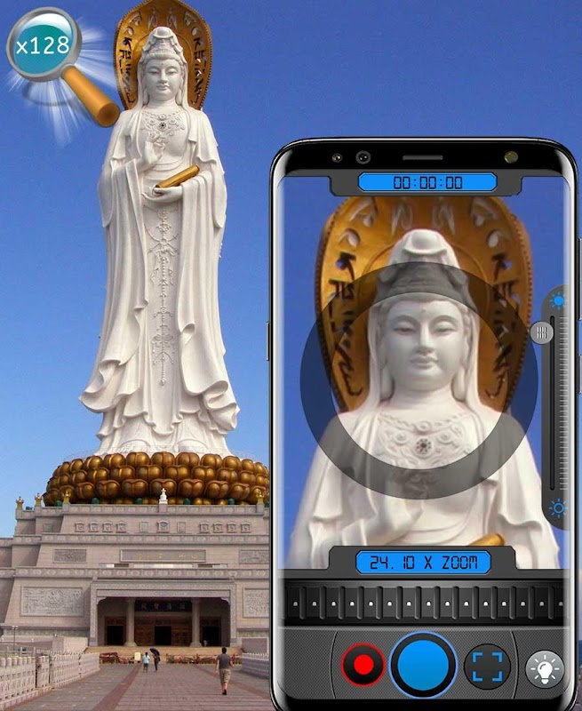 szkło powiększające z latarką powiększającą powiększy twój telefon do prawdziwej lupy, która pomoże ci zobaczyć obiekt z bardzo dużej odległości, lub nagrać całą scenę, którą od ciebie zależy. ta aplikacja używa zoomu cyfrowego aparatu cyfrowego, więc jakość zależy od rozdzielczości aparatu telefonu i liczby klatek na procesorze.