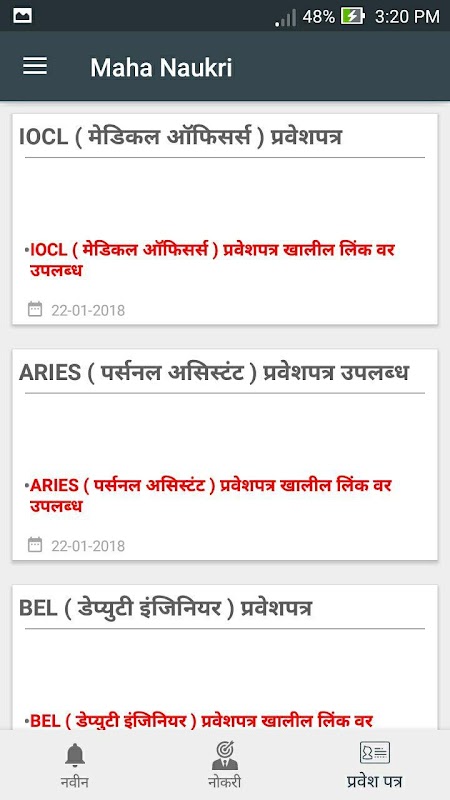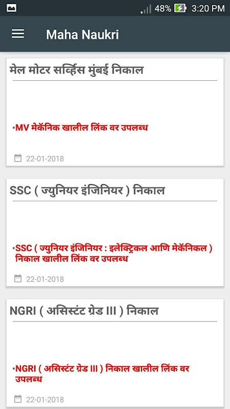 Maha Naukri is a simple, easy-to-use and fast app to receive government job alerts.It is a most reliable source to receive imformation of all important government jobs, exams,halltickets and results. Maha Naukri App users also receive Daily GK updates about current affairs and general knowledge. Maha Naukri has separate sections for New Jobs, Halltickets, results, and Daily GK. It works on very little size of device memory and RAM. That,s what makes this app very easy and fast. Install Maha Naukri app now and never miss an opportunity to get your dream job.