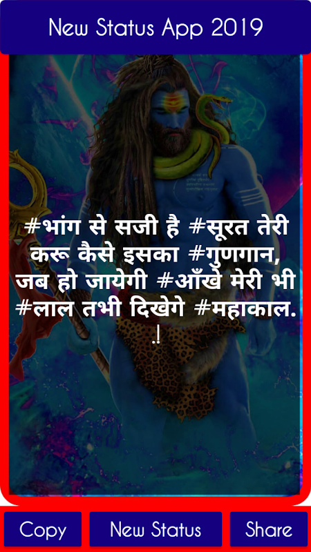This app brings you the best Mahakal Attitude Status in Hindi for 2019- 2018. Show your attitude & personality with these महाकाल एट्टीट्यूड स्टेटस in Hindi. These short mahadev attitude status for WhatsApp are Hindi msgs which can be sent as an SMS or can be set as a Shivay WhatsApp status or it can also be used as a new Bholebaba WhatsApp image status.