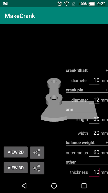 Oblicza na podstawie określonej wartości i generuje SVG (2D) lub STL (3D) ramienia korby.