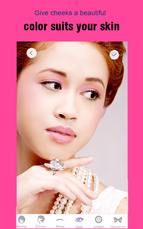 Welcome to this modern beauty salon! You can become a personal makeup artist and you can play with your look you want! Every girl's dream is to try as many different makeup ideas. Without difficulty and without heavy makeup on her face! With the help of this wonderful application for Android ™ devices, "Makeup Camera Beautiful", it is possible! Create a new image with your new fashion studio! will help you become a real beauty. You can enjoy the experience with various photo effects!