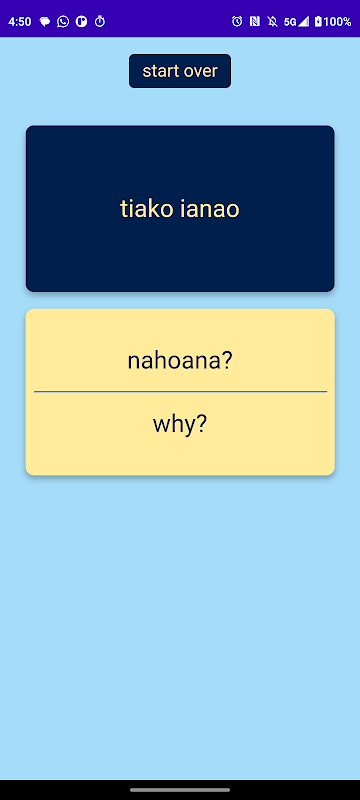 Celem tej aplikacji jest pomoc w zapamiętaniu kilku popularnych wyrażeń i przydatnych słówek z języka malgaskiego, którym mówi się na Madagaskarze. Aby skorzystać z aplikacji, wystarczy określić zakres kart, które chcesz przeglądać z całego zestawu. Możesz również zmienić język wyświetlany jako pierwszy, zaznaczając pole wyboru „Zamień języki”. Kliknij przycisk „Start”, a fiszki z wybranego zakresu zostaną potasowane. Kliknięcie górnej karty na stosie spowoduje wyświetlenie odpowiedzi, a także jej przesunięcie w dół. Jeśli klikniesz kartę ponownie po jej odkryciu, zostanie ona przeniesiona na stos „Powtórz”, abyś mógł spróbować ponownie później.