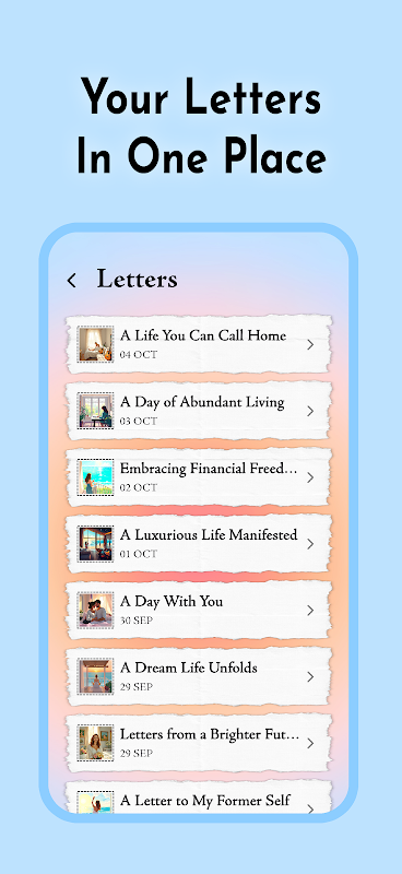 Codzienne listy od Twojej przyszłej jaźni: Codziennie otrzymuj spersonalizowane listy od swojej przyszłej jaźni, żyjąc swoim wymarzonym życiem i prowadząc Cię do urzeczywistnienia swoich celów.