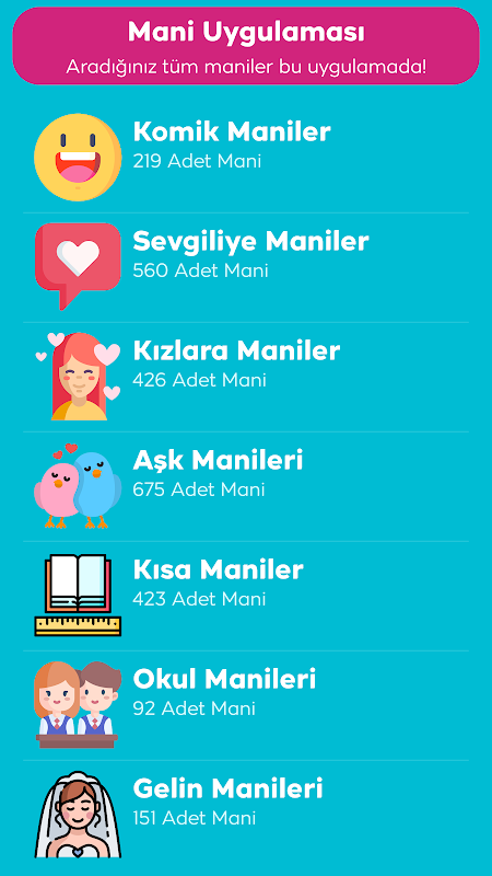 Mani jest niezależnym gatunkiem literackim, posiadającym własne, niepowtarzalne cechy, nieograniczonym tematycznie i tradycyjnie stereotypowymi melodiami w anonimowej tureckiej poezji ludowej, a także formą wersetową, podobnie jak epos, a nawet bieganie.