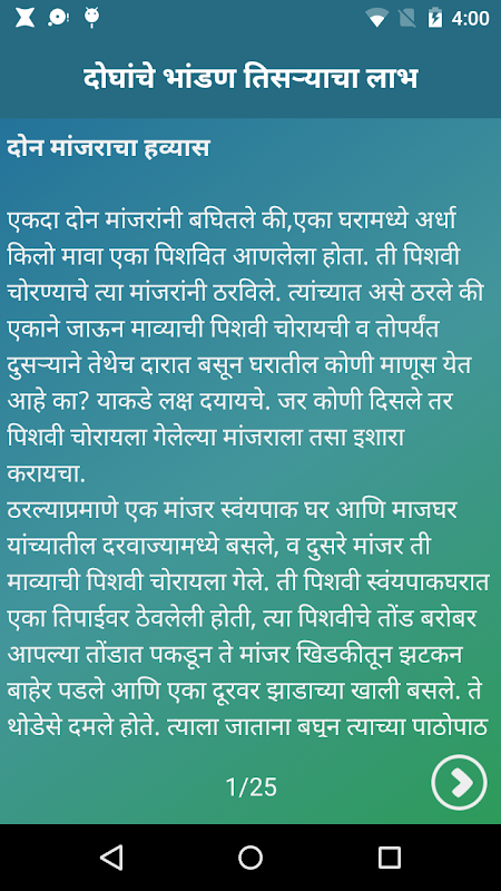 या अँप मधून म्हणी सोबत त्याचा अर्थ व त्या म्हणी वरील आधारित गोष्टींचा समावेश या अँप मध्ये करण्यात आला आहे.