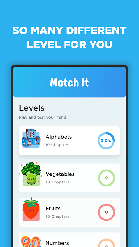 Match it wykorzystuje kolorowe projekty, obrazki i dźwięki, dzięki czemu jest zabawny i interaktywny. Ta gra zawiera wiele poziomów i jest bardzo łatwa w użyciu, dzieci mogą grać bardzo łatwo.