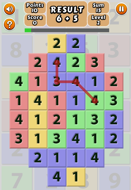 Hint: Use more squares in your chain to get a higher score. Keep an eye on the sum box to keep track of the chain's total.