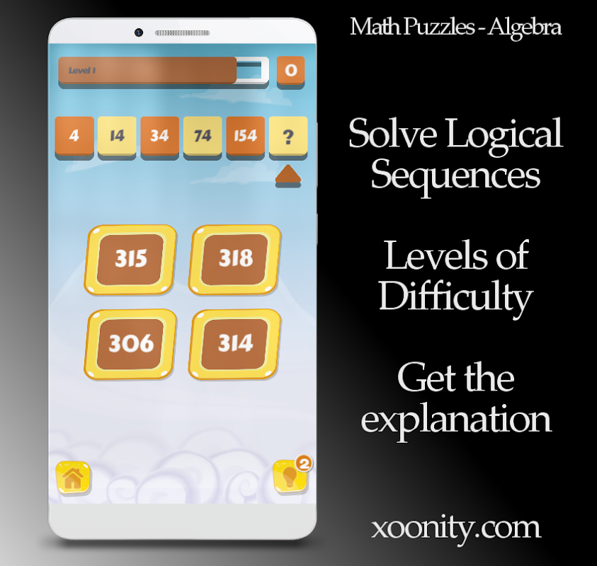 Solve Math Puzzle in the time allowed, Play 2048 Game, Logical Sequences, Equations and much more. Tease your brain! Improve your score, improve your Algebra skills, your Math skills. Choose your level, Beginner Game, Intermediate Game, Advanced Game.