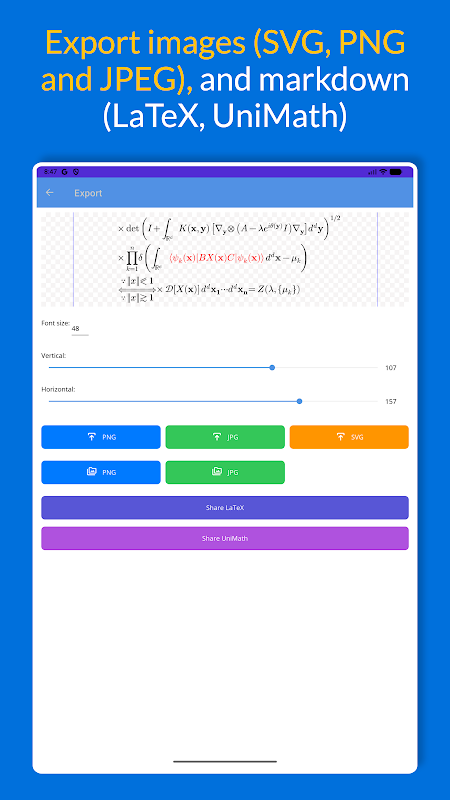 - kopiowanie LaTeX-a do schowka, udostępnianie jako obrazy .jpg lub .png
