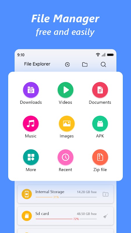 File manager will help you find and categorize file easily. manage tons of files on your mobile device? Try Max File Explorer File Manager, see and manage all files, apps, videos and photos downloaded on your local device.