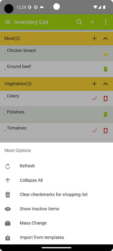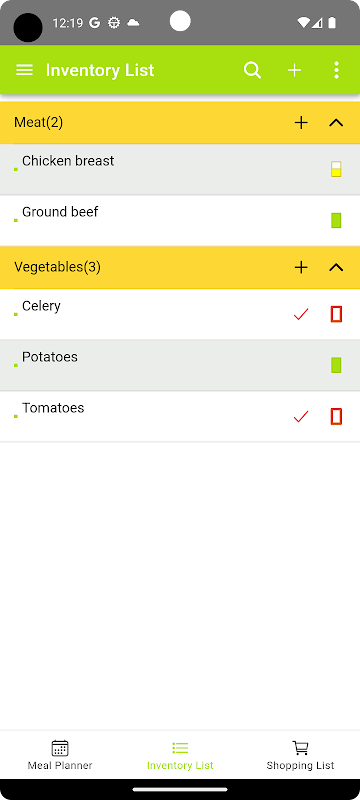 Wizualny wskaźnik poziomu zapasów: Planer posiłków z wdziękiem oświetla poziomy zapasów za pomocą wskaźników wizualnych. Proste spojrzenie pokazuje, które produkty wymagają uwagi, prowadząc Cię do świadomych wyborów i zapobiegając niespodziankom w spiżarni w ostatniej chwili.