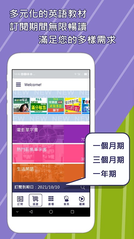 ◎ Subskrypcja: miesięczna subskrypcja, ciesz się książkami do nauki języka angielskiego z całej biblioteki, 150 NT $ (4,99 USD) przez jeden miesiąc, 360 NT $ (11,99 USD) przez trzy miesiące, 990 NT $ (32,99 USD) przez jeden rok