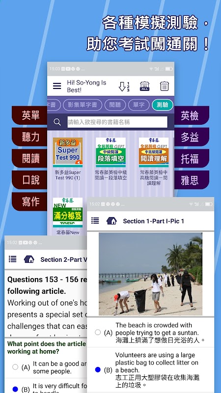 1. Zapewnij zróżnicowane i bogate treści do nauki, w tym angielski życiowy, zawodowy, podróżniczy, czytelnicy angielskiego, słownictwo, słuchanie i czytanie, szkoły podstawowe i gimnazja, szkoły średnie, test z języka angielskiego (GEPT), TOEIC (TOEIC), TOEFL (TOEFL) , IELTS i inne kategorie.