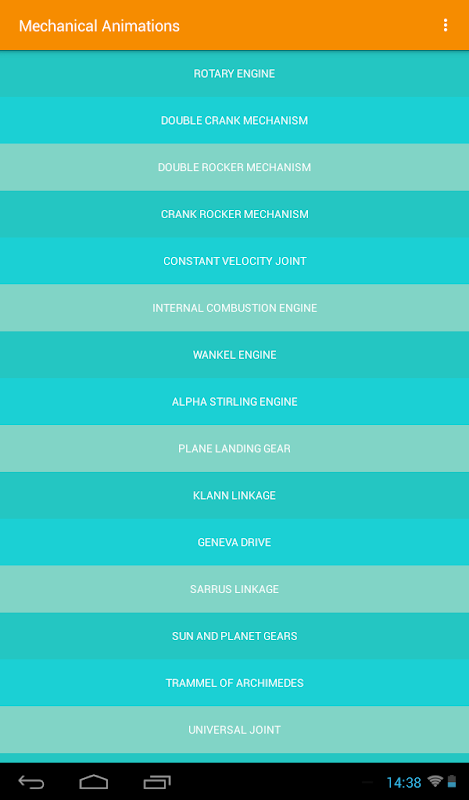 Również w tej aplikacji Mechanical Design Engineering, animacje obejmują wzory alfa silnika Stirlinga, mechaniczny model inżynieryjny klann wiązaniem, wzory modelu inżynierii rozrządu, konstrukcja aplikacji modelu silnika Wankla, modelu mechanicznego napędu Genewa, mechaniczny animacji konstrukcyjnej płaszczyzny lądowania, mechaniczny model inżynierii Sarrus wiązaniem, konstrukcja mechaniczna przegubu uniwersalnego, i wiele więcej!