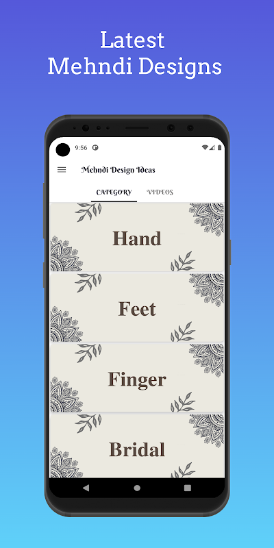 Ta aplikacja zawiera następujące kategorie projektów mehndi: