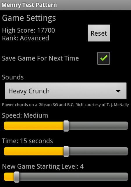 The rules of Memry Test Pattern are simple: Touch the "Play" button and watch and listen to the pattern. Then touch the color bars in the same order before time is up to score points. It starts out simple but quickly becomes more difficult. You can change the sounds and game settings at any time to make it easier or more challenging.