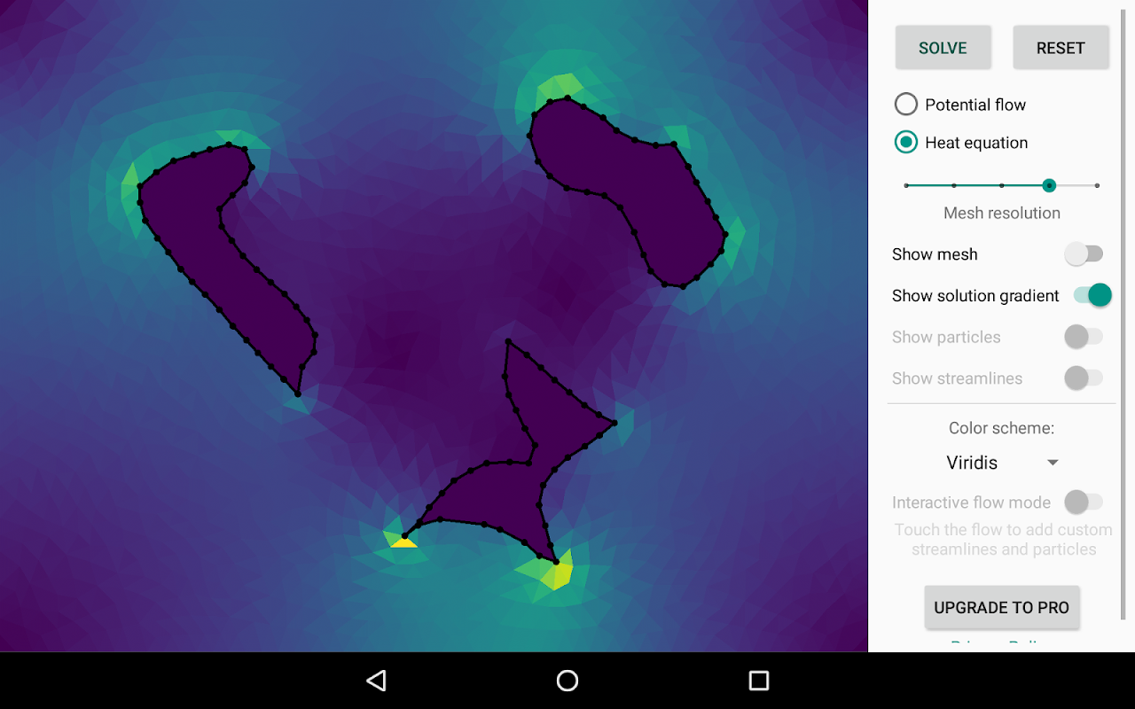 Następnie wybierz typ problemu, który chcesz rozwiązać, potencjalny przepływ lub transfer ciepła, a następnie naciśnij „Rozwiąż”, aby obliczyć i wizualizować rozwiązanie.